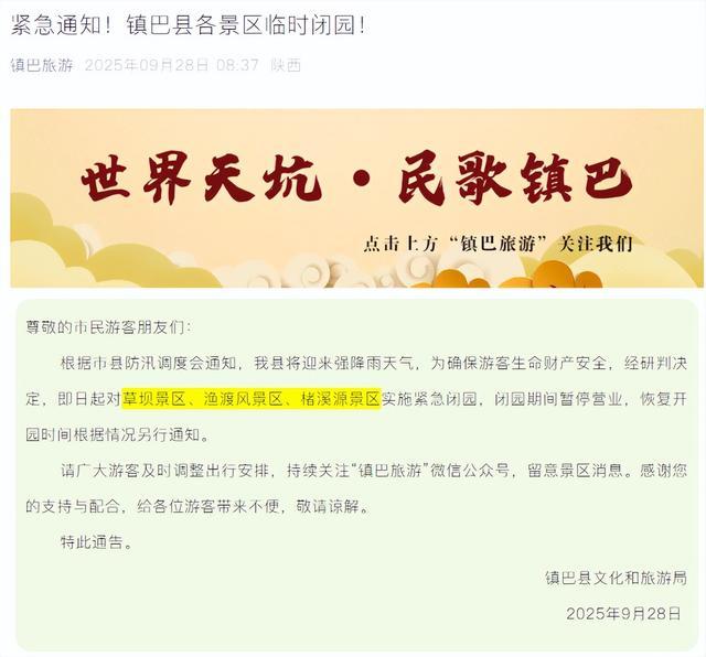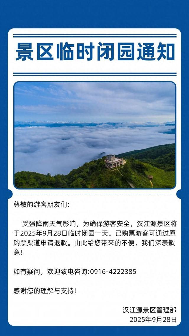 请广大游客及时调整出行安排,持续关注“汉中市旅游”微信公众号,留意景区消息。感谢您的理解与支持,给各位游客带来不便,敬请谅解。